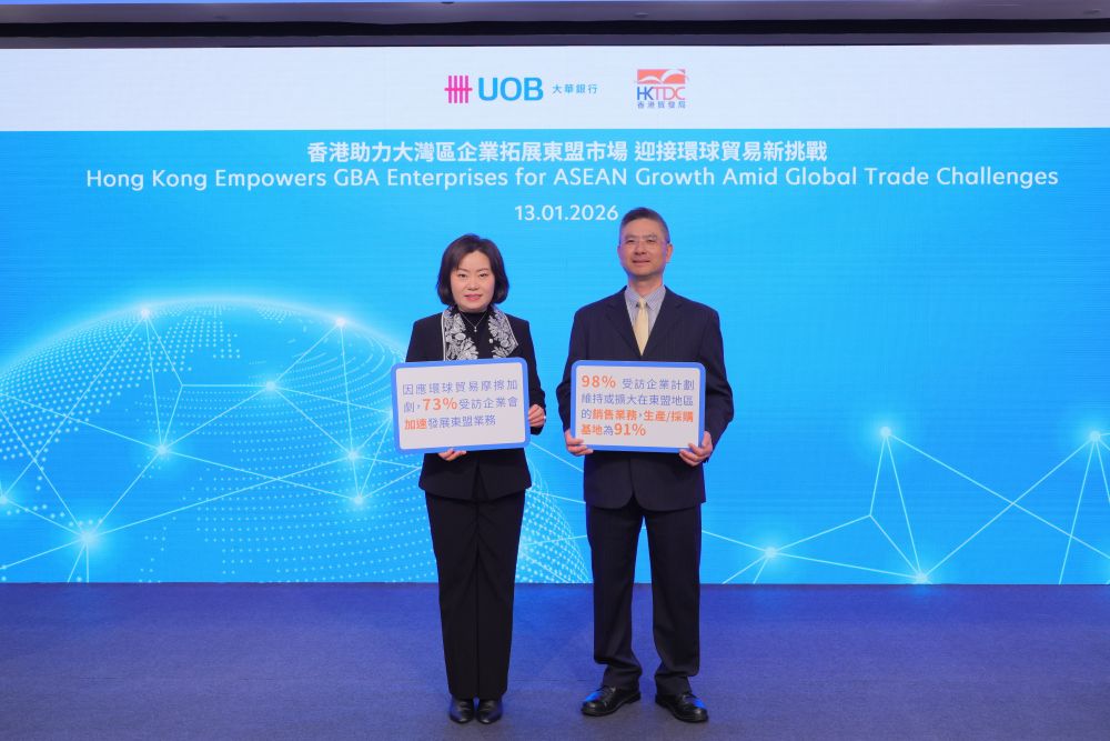 在環球不確定性升溫及關稅壓力加劇的背景下,粵港澳大灣區(大灣區)企業正加快進軍東盟市場。大華銀行(香港)與香港貿易發展局(香港貿發局)聯合發表《香港助力大灣區企業拓展東盟市場 迎接環球貿易新挑戰》研究報告,指出大灣區企業正加緊推進東盟擴展策略,以促進業務增長並提升供應鏈韌性。報告顯示,73%大灣區受訪企業計劃加快在東盟的業務發展,進一步印證在全球貿易摩擦下,東盟的重要性日益上升,成為企業長遠且愈見迫切的增長引擎所在。